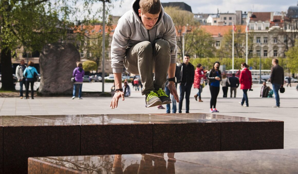 While many consider parkour a minimalist sport, possessing the right gear can greatly impact your experience. Begin with appropriate footwear designed for impact absorption and traction. Shoes that provide stability and flexibility will aid various parkour movements. Ensure they fit well; ill-fitting shoes can lead to unnecessary injuries. Comfortable clothing is equally important; opt for breathable materials that allow for unrestricted movement. Baggy shorts or stretchable pants can work well, ensuring you won’t be restricted while performing tricks. Accessories such as gloves can also enhance grip, making various movements smoother. Don’t forget the importance of safety gear, especially for beginners. While not required for every session, using protective gear such as knee pads can help prevent injuries during falls. Carrying a small backpack can also be advantageous during training sessions, allowing you to bring essential supplies or water. Consider incorporating a light mat for practicing landings. These mats absorb impact, providing a safer platform for honing techniques. Utilize these gear essentials to maximize training performance and safety.