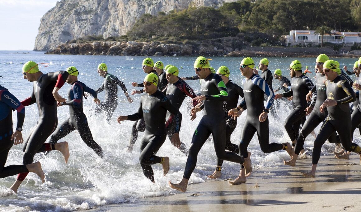 Moving to the full Ironman distance swim, usually a daunting 3.8 kilometers, the training approach must be comprehensive and strategic. Swimmers should aim to create a strong aerobic base through longer swims that can encompass nearly all swim sessions. Practicing long, slow swims on weekends helps to condition the body for the extensive distance while ensuring no training session goes to waste. Furthermore, integrating both strength and functional exercises will create balance within the necessary muscle groups to support swimming dynamics. Key workouts should target both form and efficiency, making adjustments while swimming longer intervals. It’s important to also incorporate open-water swims to mimic race conditions, as many athletes find this aspect challenging. Using buoy sets to improve core stability while working on breathing rhythm can significantly benefit endurance. A structured training plan should include progressive swims that naturally lead to fatigue while focusing on maintaining correct technique. Igniting the body’s adaptive responses within the water ensures athletes build the strength and confidence necessary to conquer the full swim course of an Ironman with ease.